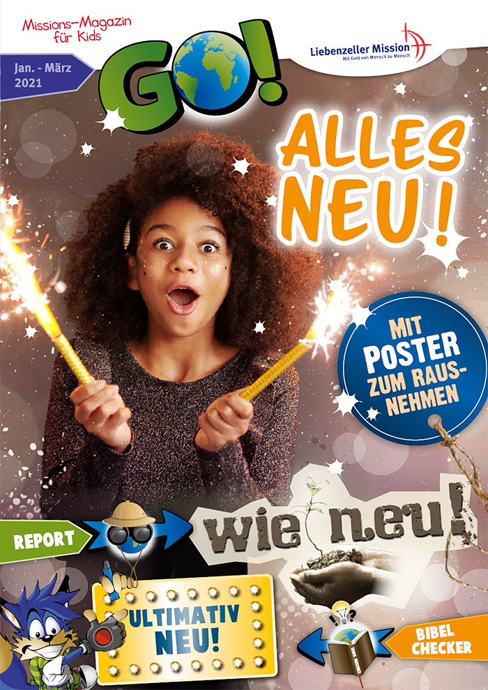 · Report aus Sambia: Wie neu! · Report aus Papua-Neuguinea: Der große Umzug · Fotostory aus Spanien: Neu, Neu, Neu · Poster: Dieser Gott begleite und beschütze dich … · Bibelchecker: Ultimativ neu! · Spezial: Aus Alt macht Neu · Kuntibunti: Witze, Rätsel, Missionini-Sammelbilder · und viele weitere Themen