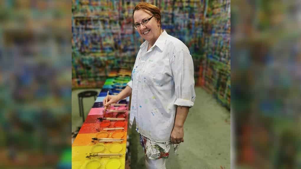 Person in weißem Hemd lächelnd, stehend an einem Tisch mit bunten Farben, Pinseln und weißem Blatt Papier, lebendiger Hintergrund.